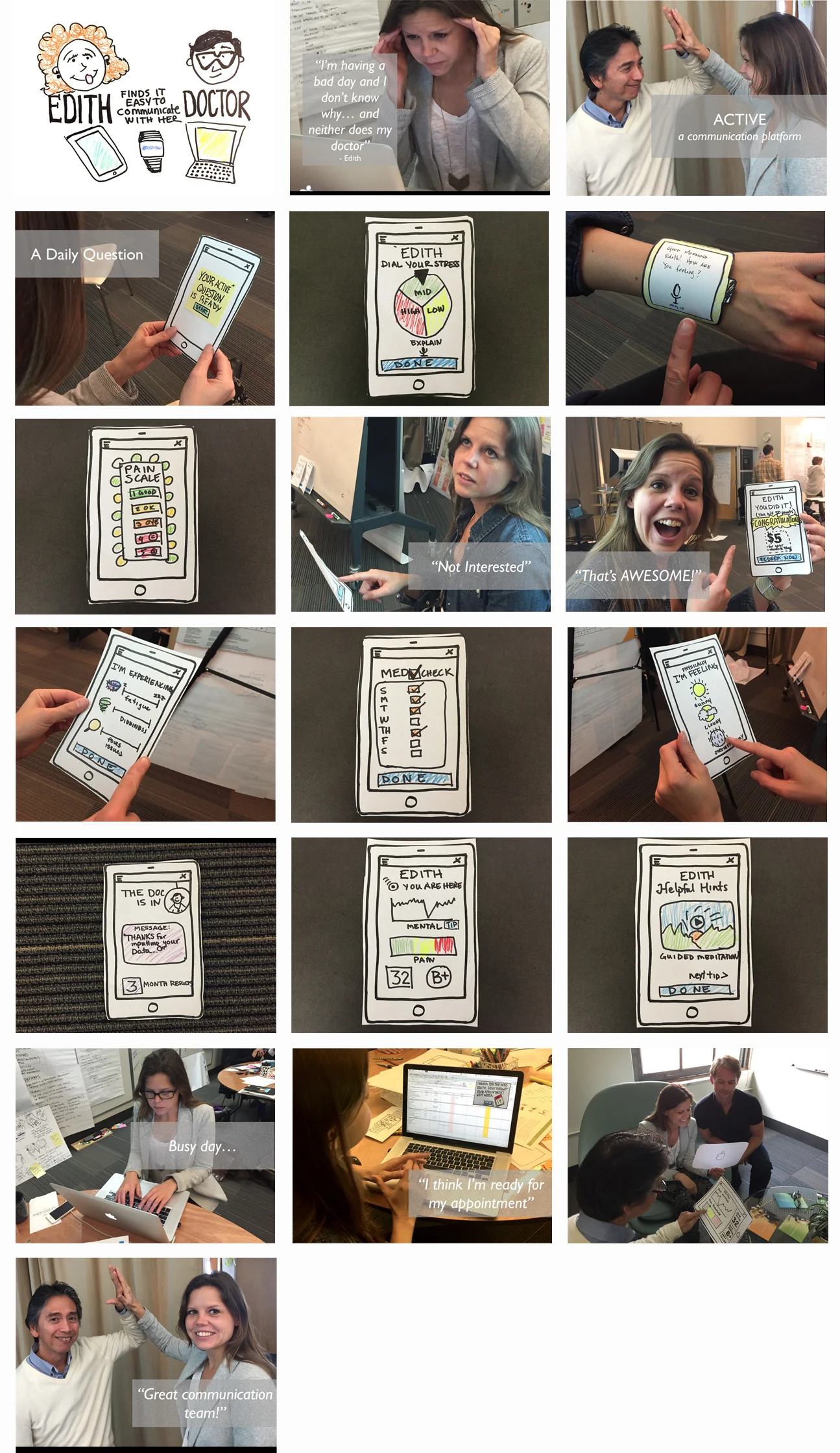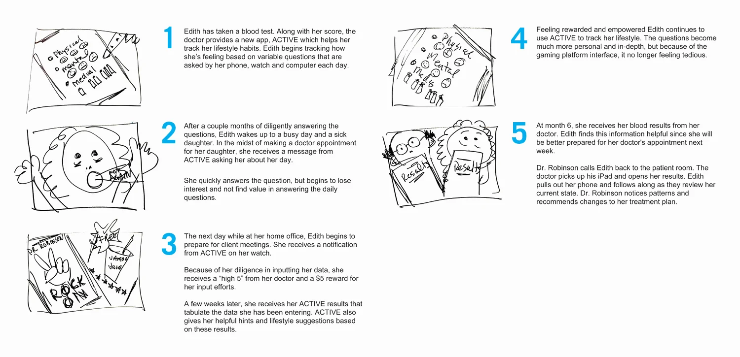 A storyboard was created to craft Edith's path from diagnosis of MS using the patented blood test and the doctors introduction of ACTIVE that will provide better communication between doctor, her core caregivers, friends and family by giving everyone an open forum for sharing test results, data and feedback.