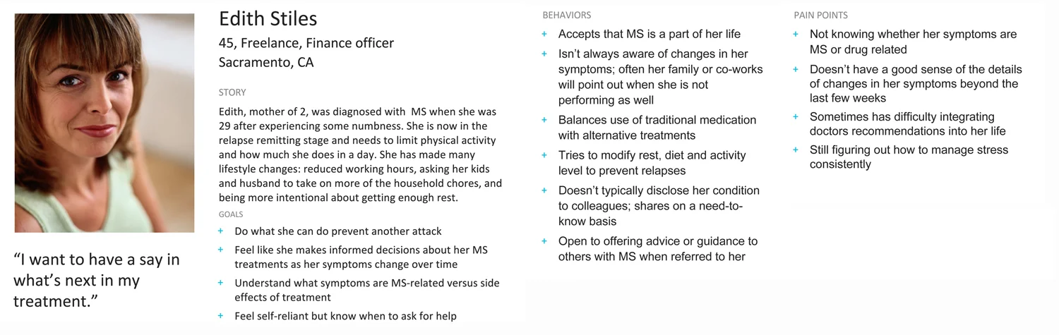 - Patterns were identified and a persona selected that best reflected both business and the MS patients' user goals.