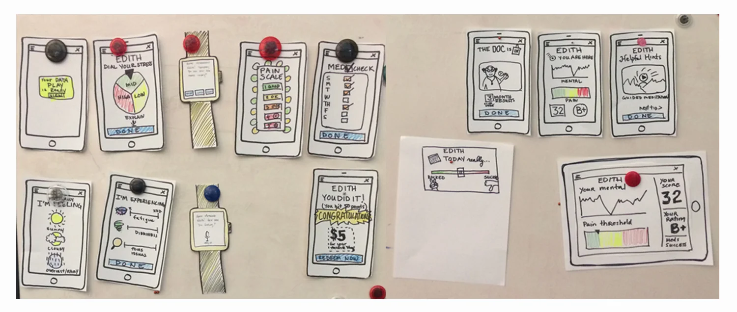 With only a day to build, paper prototypes were created to quickly articulate key daily routine check-ins of ACTIVE. The prototypes were personalized by adding Edith's name and rewarding her with cash towards her favorite retail shops.